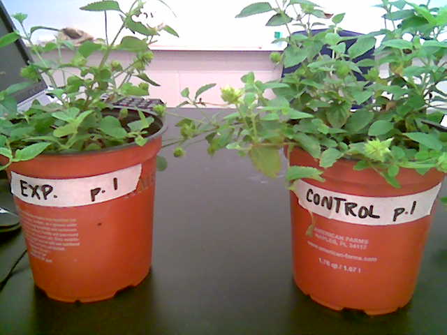 ACID RAIN PLANT LAB -- before the experiment: "experimental" and "control" lantana plants for one class